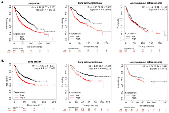 Kaplan–Meier survival curves based on HMGA1 expression level by Kaplan–Meier plotter: (A) the overall survival for all lung cancer patients (n = 1925), lung adenocarcinoma patients (n = 719), and squamous cell lung carcinoma patients (n = 524); (B) the first progression survival for all lung cancer patients (n = 982), lung adenocarcinoma patients (n = 461), and squamous cell lung carcinoma patients (n = 141).