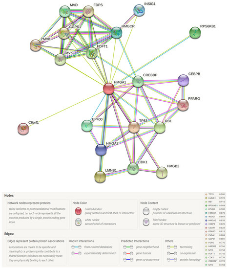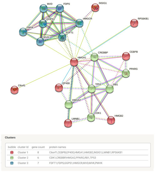 The STRING database [60] (https://string-db.org/, accessed on 1 January 2022) was used to build a protein–protein interaction (PPI) network querying the protein “HMGA1” and organism “Homo sapiens”. The main parameters were set as follows: the minimum required interaction score was 0.7 and no more than 50 interactors to show. K-means clustering of the generated PPI network was performed with a pre-set of three clusters.