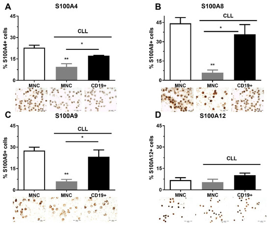 As part of clinical analyses, FISH analysis was performed on CLL patients at diagnosis. Although this analysis was not performed on 58.3% of patients, a large number of patients had deletions (21.7%, Del 13q, 11q, 17p), and Trisomy 12 (10%) (Table S1, see Supplementary Materials). We also found that the immunoglobulin heavy chain gene (IgHV) was mutated in nine CLL patients and was unmutated in four of them (Table S1). We analyzed the quantity of S100A4, S100A8, S100A9, and S100A12 immunopositive MNCs and CD19+ cells in CLL patients regardless of genetic abnormalities. S100A4, S100A8, and S100A9 had a similar pattern of expression and showed a higher level of immunopositive cells in the MNCs of healthy controls than in CLL patients, and demonstrated a higher level of expression in CD19+ cells than in MNCs of CLL patients (Figure 1). The percentage of S1000A8 (p < 0.01, Figure 1B) and S100A9 positive cells (p < 0.01, Figure 1C) were significantly decreased in MNCs of CLL patients in comparison to healthy controls. Generally, the examined S100A proteins were decreased in MNCs of CLL patients.