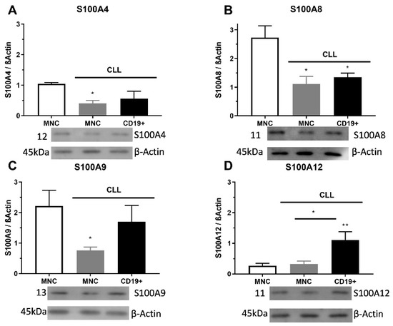 Level of pro-inflammatory S100As proteins in mononuclear cells (MNCs) and CD19+ cells of peripheral blood of chronic lymphocytic leukemia (CLL). (A) S100A4, (B) S100A8, (C) S100A9, and (D) S100A12 protein levels in MNCs and CD19+ cells of CLL were determined by Western blotting. Data results are presented as mean ± SD (n = 4). * p < 0.05, ** p < 0.01 versus MNCs from healthy donors.