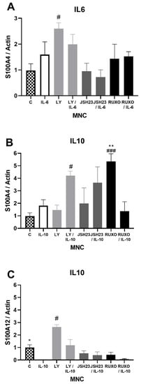 2.5. S100As Protein Expression after Treatment of MNCs with Anti-Inflammatory Cytokine IL-10