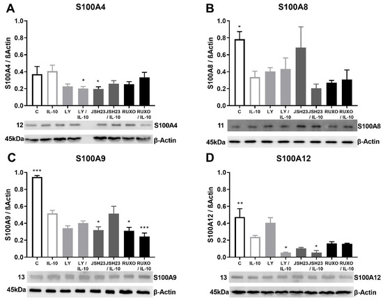Anti-inflammatory cytokine IL-10 generally reduced the S100As (except S100A4) protein expressions in MNCs of CLL patients (Figure 5). The S100A4 protein expression was significantly decreased mutually by the PI3K inhibitor (Ly294002) and IL-10 (p < 0.05) in MNCs of CLL (Figure 5A). IL-10 significantly reduced level of S100A8 (p < 0.05), S100A9 (p < 0.001), and S100A12 (p < 0.01) protein expressions in MNCs of CLL (Figure 5B–D). The most significant decrease in S100A9 protein expression was detected after mutual treatment of MNCs with Ruxolitinib and IL-10 (p < 0.001, Figure 4C). S100A12 protein expression was additionally decreased after combined treatment of Ly294002 and IL-10, as well as the combination of JSH23 and IL-10 (p < 0.05, Figure 4D). IL-10 stimulated reduction of the S100As protein levels was magnified by inflammation-related signaling pathways in CLL.