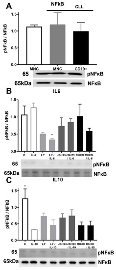 Activation of inflammatory NF-κB signaling pathway in mononuclear cells (MNCs) of peripheral blood of chronic lymphocytic leukemia (CLL). Activation of NF-κB signaling in (A) MNCs and CD19+ cells of CLL (n = 3); (B) MNCs treated 1 h by 20 µg/mL IL-6 with and without 0.6 nM Ruxolitinib, 5 nM LY294002, and 0.75 nM JSH23; (C) MNCs treated 1 h by 30 µg/mL IL-10 with and without 1.2 nM Ruxolitinib, 10 nM PI3K inhibitor, and 1.5 nM NF-κB inhibitor JSH23. Data are presented as mean ± SD (n = 5). * p < 0.05, versus IL-6 or IL-10 treated MNCs.