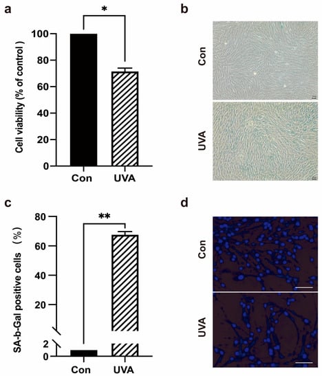 UVA can induce photoaging in foreskin dermal fibroblasts. (a) Cells were treated with UVA. The cell viability of HFFs were detected by MTT assay. (b,c) Cells were treated with UVA, the activity of senescence-associated β-galactosidase and the percentage of cells positive for SA-β-galactosidase staining (40×) were measured. (d) HFFs were treated with UVA, stained with Hoechst 33258. Cell morphology was observed by fluorescence microscopy (200×). Data are presented as mean ± SD, n = 3. * p < 0.05, ** p < 0.01.