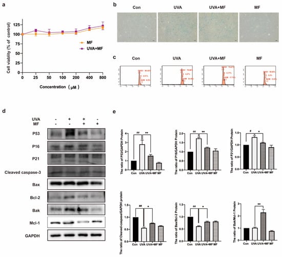 MTT assay results revealed that MF was not toxic to HFFs, and 100 μM MF treatment improved the survival rate of HFFs induced by UVA irradiation (Figure 2a). The effect of MF on UVA-induced cellular senescence was then examined. As shown in Figure 2b, MF treatment significantly reduced the ratio of SA-β-galactosidase staining compared to UVA-irradiated cells. The cell cycle was detected using flow cytometry. MF reduced the proportion of cells in the G2/M phase after UVA irradiation (Figure 2c). Western blotting was used to detect the protein expression levels. As shown in Figure 2d,e, MF reduced the expression levels of P53, P21 and P16 in UVA-irradiated cells. In MF-treated photoaged cells, the protein expression levels of Bax/Bcl−2, BAK/Mcl−1, and cleaved caspase−3 increased. The above results indicated that MF could improve cell photoaging induced by UVA irradiation and induce apoptosis in photoaging cells.
