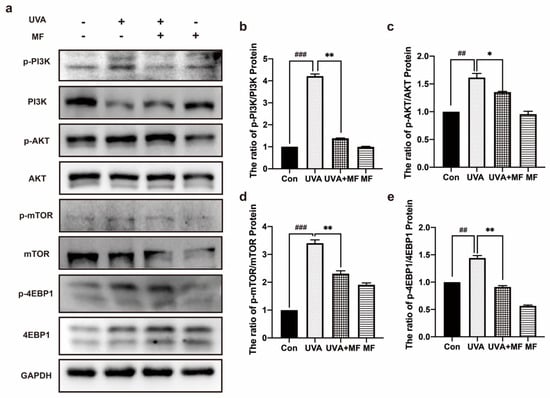 The most direct damage of ultraviolet (UV) radiation is DNA damage, resulting in DNA breakage and mismatch. In addition, UV radiation can cause the production of substantial amounts of reactive oxygen species (ROS) in cells, which further damages DNA. The PI3K/AKT/mTOR pathway is crucial for DNA damage repair, cell proliferation, apoptosis, inflammation, and other cellular activities. Protein expression in the PI3K/AKT/mTOR pathway was detected by western blotting. Figure 3 showed that the phosphorylation levels of PI3K, AKT, mTOR, and 4EBP1 were significantly enhanced in HFF cells upon UVA irradiation. However, MF treatment significantly reduced the expression levels of these proteins in photoaged HFF cells. This suggests that UVA irradiation induces the initiation of the PI3K/AKT/mTOR signaling pathway, whereas MF inhibits its activation.