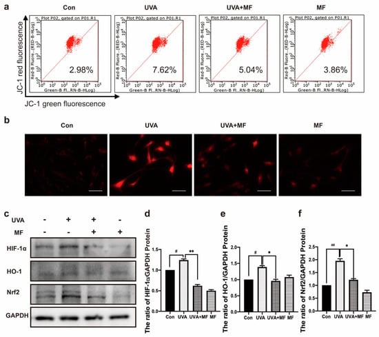Mitochondria are one of the main targets of ROS destruction, and severe mitochondrial oxidative damage usually leads to mitochondrial dysfunction. JC−1 was used to detect the effect of MF on mitochondrial membrane potential in UVA-induced photoaged HFFs. As shown in Figure 4a, the mitochondrial membrane potential of photoaged cells was significantly reduced by UVA irradiation, while MF treatment upregulated the mitochondrial membrane potential of photoaged cells. In addition, MitoTracker Red CMXRos was used to detect ROS levels in mitochondria. As shown in Figure 4b, compared to untreated HFFs, the mitochondrial ROS level in photoaged cells induced by UVA irradiation was significantly enhanced, while MF reduced the accumulation of ROS induced by UVA irradiation. Elevated levels of ROS in cells may activate the HIF–1α pathway; western blotting was used to detect the protein expression levels of HIF–1α, HO–1, and Nrf2. UVA induced HIF–1α, HO–1, and Nrf2 protein expression and combined treatment with MF reduced HIF−1α, HO−1, and Nrf2 protein expression levels (Figure 4c−f). These results suggest that MF can alleviate UVA-induced oxidative stress.
