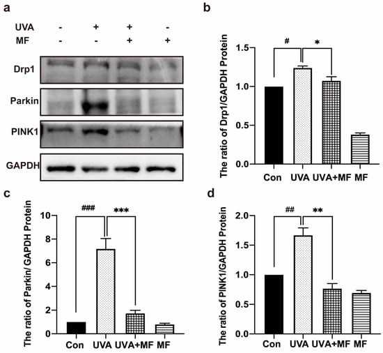 Mitophagy is a form of autophagy that selectively targets damaged mitochondria to maintain mitochondrial homeostasis. Additionally, mitochondrial division determines mitophagy. To investigate whether UVA can activate PINK1/Parkin-dependent mitophagy and the effect of MF on mitophagy in photoaged cells, the protein expression of Drp1, PINK1, and Parkin in HFFs was detected using western blotting. Figure 5 shows that UVA irradiation significantly increased the expression levels of Drp1, PINK1, and Parkin, whereas MF decreased the expression levels of these three proteins in photoaged cells. Therefore, UVA exposure induced PINK1/Parkin-dependent mitochondrial autophagy in HFFs cells, whereas MF reduced PINK1/Parkin-dependent mitochondrial autophagy in photoaged cells.