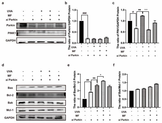 To further verify the effect of mitophagy on UVA-exposed HFF cells, we used siRNA to knockdown Parkin expression. Western blotting results revealed that si Parkin significantly downregulated the expression of Parkin without changing the expression level of PINK1 in the HFFs, indicating that mitophagy was effectively inhibited (Figure 6a–c). To determine the effect of mitophagy inhibition on the HFFs, the apoptosis of the HFFs after parkin knockdown was detected. Western blotting results revealed that after parkin knockdown, the ratio of apoptosis-related proteins Bax/Bcl−2 and Bak/Mcl−1 in UVA-irradiated HFFs increased, and MF treatment increased the ratio of Bax/Bcl−2 and Bak/Mcl-1 in photoaged cells (Figure 6d–f). These results indicate that the inhibition of mitophagy can increase apoptosis in photoaging cells, whereas MF can promote apoptosis.