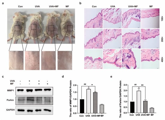 In addition, western blotting was used to detect the expression level of the photoaging-related proteins MMP1 in mice skin. The results revealed that compared with the untreated mice, the MMP1 protein expression level in the mice exposed to UVA increased, and the MMP1 protein expression level in the skin of the MF combined with UVA-treated mice decreased (Figure 7c–e). The results revealed that UVA irradiation can lead to skin aging in mice, with the increased breakdown of collagen. Western blotting was used to detect the expression of the mitophagy protein Parkin. The results revealed that UVA irradiation increased the expression level of Parkin in mouse skin, while MF reduced its expression level.