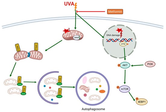 UVA increases mitochondrial ROS levels and decreases mitochondrial membrane potential, leading to mitophagy, and induces DNA damage and activates PI3K/AKT/mTOR signaling pathway, which causes cell senescence, while metformin suppresses mitochondrial damage, mitophagy, and PI3K/AKT/mTOR signaling pathway response to UVA-induced photoaging.