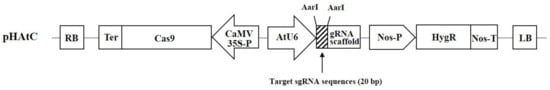 Each sgRNA was cloned into the Cas9-sgRNA-expressed plant binary vector, pHAtC, and transformed into Agrobacterium tumefaciens GV3101. For transformation, each plant binary vector was transformed into hypocotyl segments of the Chinese cabbage inbred line DH03 (Figure 1).