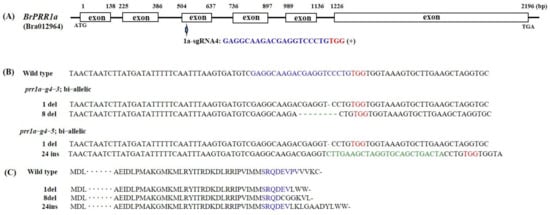 Genome editing of the Chinese cabbage BrPRR1a gene. Design of sgRNA sites for BrPRR1a exons. The PAM motif (NGG) is shown in red (A). Next-generation sequencing (NGS) alignment of the sgRNA target region in different mutant lines. Deletions and insertions are indicated by dashes and green letters, respectively (B). Amino acid sequences of wildtype and generated mutations are shown (C). The sgRNA and PAM site are represented in blue and red. Stop codon is shown with black dash.