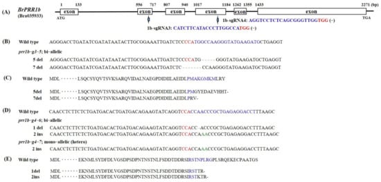Genome editing of the Chinese cabbage BrPRR1b gene. Design of sgRNA sites for BrPRR1b exons. The PAM motif (NGG) is shown in red (A). NGS alignment of the sgRNA target region in different mutant lines. Deletions and insertions are indicated by dashes and green letters, respectively (B,D). Amino acid sequences of wildtype and generated mutations are shown (C,E). The sgRNA and PAM sites are represented in blue and red. Stop codon is shown with black dash.