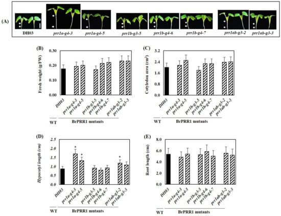 Phenotypes of B. rapa seedlings in DH03 and BrPRR1a, 1b, and 1ab mutants grown under a 16 h/8 h light/dark cycle. Two representative images of each mutant of 8-day-old Chinese cabbage seedlings are shown (A). Bar = 1 cm. White arrows indicate the hypocotyl area. Fresh weight (B), cotyledon area (C), hypocotyl length (D), and root length (E) of 8-day-old Chinese cabbage sprouts. Values are the means of three biological replicates, and error bars indicate standard deviation (SD). * p < 0.05 compared with wildtype control (DH03).