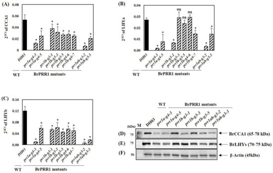In a previous study, we identified candidate paralogs of circadian clock-related genes and assessed their expression levels in Chinese cabbage by RNA-sequencing (RNA-Seq) [34]. Based on RNA-Seq data, the B. rapa genome contains three MYB transcription factor genes, a single copy of the BrCCA1 gene, and two copies of the BrLHY gene (BrLHYa and BrLHYb), which play key regulatory roles in the endogenous clock [3,4]. RNA-Seq data revealed that BrCCA1 and BrLHYa and b transcripts under light/dark (LD) conditions peaked at Zeitgeber time (ZT) 0 [34]. To examine the BrCCA1 and BrLHYa and b gene expression levels in BrPRR1 mutant lines, total RNA and proteins were analyzed in 8-day-old Chinese cabbage seedlings grown under a 16 h light/8 h dark cycle at ZT3 (Figure 6). Quantification of mRNA expression was performed by quantitative real-time PCR (qRT-PCR) using gene-specific primers (Table S4). In most of the BrPRR1 mutants, the BrCCA1 and BrLHYa and b mRNA expression levels were lower than in the WT (Figure 6A–C).