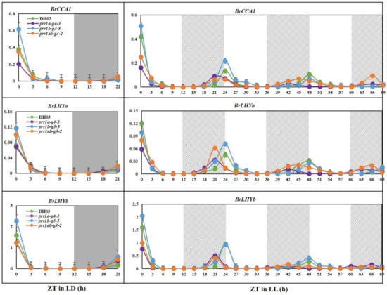 We examined the expression of core circadian clock elements, BrCCA1 and BrLHYa and b, in BrPRR1 mutants. To examine the circadian rhythms of the selected clock genes in B. rapa, we analyzed candidate gene transcript accumulation in plants grown under LD and continuous light (LL) conditions. Three transgenic plants and WT (DH03) grown under LD for 1 day and under LL for 3 days were harvested every 3 h. Quantification of mRNA expression was performed by qRT-PCR using gene-specific primers (Table S4). BrCCA1 and BrLHYa and b transcripts were largely unchanged under LD and LL, although their levels of expression were lower in the prr1a-g4-3 and prr1ab-g3-2 mutants than WT, except for prr1b-g3-5 (Figure 7). Interestingly, BrCCA1 and BrLHYa and b transcripts showed clear circadian rhythm with a peak at ZT21 under LL in the prr1a-g4-3 and prr1ab-g3-2 mutants, while WT and prr1b-g3-5 peaked at ZT24. These results indicated that the period of circadian-related gene expression in the prr1a-g4-3 and prr1ab-g3-2 mutants was shortened by an average of 3 h compared to WT and prr1b-g3-5 (Figure 7).