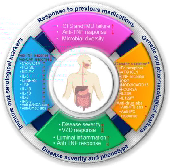 Immune markers: Immune markers such as fecal inflammatory markers (calprotectin and lactoferrin) and blood CRP are known predictors of active intestinal inflammation and long-term response to treatment in both CD and UC patients [,]. Higher levels of FC displayed an association with non-response to Infliximab in severe UC patients, and were an indication of treatment failure [,], whereas a lower level of FC (<250 µg/g), after eight weeks of initiation of Vedolizumab treatment in IBD patients, can positively predict a histological and endoscopic response to therapy []. Other emerging fecal inflammatory markers, such as the dimeric M2 isoform of pyruvate kinase (M2-PK), have been found to be more accurate in predicting response to Infliximab in patients with active UC [] than non-specific FC. Furthermore, non-responders to anti-TNF and anti-integrin therapies show higher levels of IL-6, sTNFR2 e, TNF-α, IL-1, IL-10, IL-8, and IFN-γ than responders [,,,].