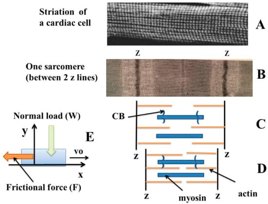 Schematic representations of myofilaments in sarcomeric heart muscle and tribological cardiac system. Cardiomyocytes exhibit a periodic striation characterized by alternating dark A-bands (anisotropic) and light I-bands (isotropic) (A,B). The central part of the I-band is marked by the Z line. A sarcomere is the smallest functional unit of a striated muscle. It is the repeating unit between two Z-lines (B). The I-band is the zone of thin filaments that is not superimposed with thick filaments (myosin). Thin myofilaments are mainly composed of F actin, resulting from the polymerization of many globular actin molecules (G actin). The actin myofilaments are attached by their caudal end to the Z lines. Actin filaments are the major component of the I-band and extend into the A-band. Thick myosin filaments are made up of 200 to 300 molecules of native myosin. Myosin has a long, fibrous tail and a globular head that binds to actin. Myosin filaments are bipolar and extend throughout the A-band. The myosin head also binds to ATP. Muscle contraction results in the sliding of actin filaments along myosin filaments, which is visible only at the level of the I-bands, while the dark A-bands keep a constant length (C,D) [,]. This movement is controlled by the heads of the myosin molecules (CBs), which bind and then detach from the actin molecule. The displacement of myosin on actin is possible through the hydrolysis of ATP molecules. (E) refers to the normal (y) and tangential (x) degrees of freedom during dynamic friction. The thermodynamic force was equal to μ W/T, with μ the frictional coefficient, and W the normal load.