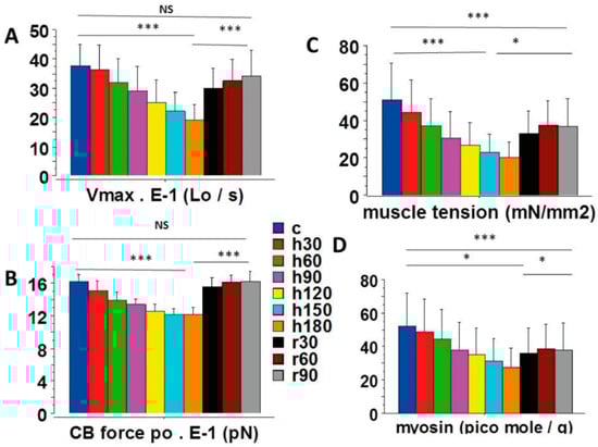 Mechanical parameters of LVPMs and CBs. (A): Maximum unloaded shortening velocity (Vmax); (B): CB single force (po); (C): total muscle tension; (D): myosin content. *: p < 0.05; ***: p < 0.001.