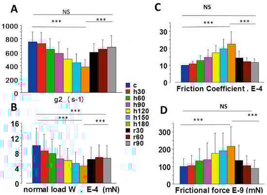 Molecular parameters of CBs. (A): CB detachment rate constant (g2); (B): normal load (W); (C): friction coefficient (μ); (D): frictional force (F). ***: p < 0.001.