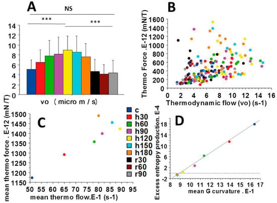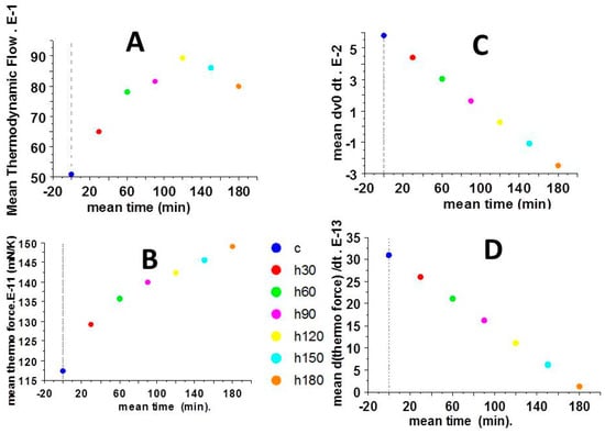 Figure 5 shows the mean values of the thermodynamic flow (vo) (Figure 5A) and thermodynamic force (F/T) (Figure 5B) versus time and their respective partial time derivative (Figure 5C,D). F/T increased over time and its partial time derivative ∂ (F/T) decreased but remained always positive (Figure 5D). Importantly, the partial time derivatives of vo, (∂vo) was positive up until 120 min, and then became negative from 150 to 180 min (Figure 5C).