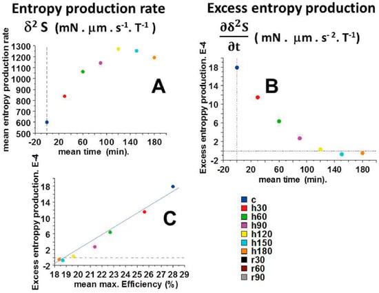 Figure 6 shows the mean values of the entropy production rate (δ2 S) (Figure 6A) and the mean values of the excess entropy production () versus time (Figure 6B). Up to 120 min of anoxia, EPR increased and then decreased from 120 to 180 min. EEP decreased continuously during anoxia but, importantly, remained positive up to 120 min of anoxia, after which it became negative (from 150 to 180 min of anoxia). The fact that EEP became negative after 150 min of anoxia demonstrates the instability of the non-linear cardiac tribosystem. Interestingly, there was a linear relationship between EEP and the CB detachment rate g2 (Figure 4D; EEP = 2.4 g2 − 22; r = 0.99). There was also a linear relationship between EEP and the maximum efficiency (Figure 6C) (EEP = 1.9 max. Efficiency-3 7; r = 0.90).
