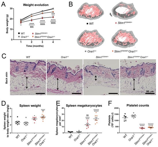 Stim1R304W/+ mice recapitulate the main clinical signs of the human disorder [], and the availability of a faithful animal model offers the possibility to establish and validate therapeutic approaches. To antagonize the development of TAM/STRMK, we crossed Stim1R304W/+ mice [] with Orai1+/− mice [] expressing 50% of the Ca2+ channel ORAI1. The resulting WT, Orai1+/−, Stim1R304W/+, and Stim1R304W/+Orai1+/− offspring underwent comparative phenotyping to conclude on the therapeutic potential of Orai1 downregulation. We assessed postnatal growth, overall development, bone architecture, spleen morphology, platelet numbers, and general muscle force at 1 to 4 months. In situ muscle force and skin cross sections were analyzed at 8 months since specific anomalies affecting both tissues occur at later disease stages in the Stim1R304W/+ model [].