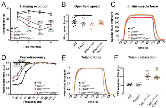 Muscle weakness and exercise intolerance are major disabling traits of TAM/STRMK []. Affected individuals have difficulties climbing stairs, running, or standing up from a squatting position, and consistently, Stim1R304W/+ mice manifest deficiencies in general and specific muscle force []. The initial characterization of the animal model did not reveal any differences of in situ muscle force upon nerve and muscle stimulation, ruling out a transmission defect at the neuromuscular junction (NMJ) as the cause of the muscle weakness []. To assess a potential improvement of muscle performance through Orai1 downregulation, Stim1R304W/+Orai1+/− and control mice underwent hanging and open field tests at 4 months complemented by force transduction experiments at 8 months. Compared with their Stim1R304W/+ littermates, Stim1R304W/+Orai1+/− mice showed non-significant tendencies of increased hanging times throughout the first 4 months (Figure 2A) and higher mean speed and covered distance in the open field at 3 months (Figure 2B and Figure S2D). In situ muscle force measurements on tibialis anterior at 8 months of age revealed an increased specific muscle force and a tendency of a higher maximal force of Stim1R304W/+Orai1+/− compared with Stim1R304W/+ mice (Figure 2C and Figure S2E).