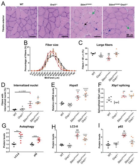 2.5. Normalized Muscle Fiber Size and Improved Autophagy Markers in Stim1R304W/+Orai1+/− Mice