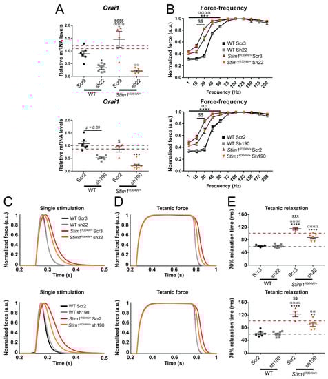The rescue of birth ratio and the improvement of postnatal development of Stim1R304W/+Orai1+/− offspring as exemplified by growth, bone structure, and muscle contractibility illustrate the therapeutic potential of Orai1 reduction for TAM/STRMK. Based on this proof-of-concept, we aimed to establish a practical method to downregulate Orai1 in our murine Stim1R304W/+ model and assess the reversal of the TAM/STRMK phenotype in postnatal muscle. We designed Orai1-specific shRNAs with homology to the human ORAI1 sequence, validated their effectiveness in cells, and delivered the most capable shRNAs via local AAV injections into the tibialis anterior of WT and Stim1R304W/+ mice. We noticed improved muscle contraction and relaxation kinetics in transduced Stim1R304W/+ animals, but no effect of the shRNAs on muscle morphology was observed—despite the reduction of Orai1 expression by more than 50%. This is possibly due to the time point of treatment at 2 months and after the onset of the disease signs, resulting in the inability to revert structural anomalies of the myofibers once established, or may be related to the physiology of skeletal muscle. Indeed, myofibers have a comparatively low turnover by contrast with monocytes or intestinal epithelial cells for instance [,]. The full therapeutic effect of the selected shRNA may therefore be visible several weeks following AAV injection and possibly beyond the incubation period of 2 months. However, Ca2+ stress-induced UPR and structural muscle anomalies such as internalized nuclei were neither rescued in shRNA-treated Stim1R304W/+ tibialis anterior nor in Stim1R304W/+Orai1+/− mice, suggesting that other limiting factors than fiber turnover account for the absence of rescuing effects on reticular stress and myofiber degeneration.