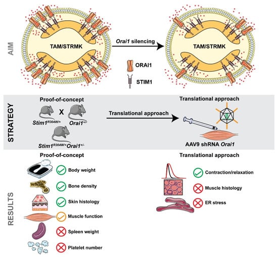 Tubular aggregate myopathy (TAM) and Stormorken syndrome (STRMK) are spectra of the same multi-systemic disease affecting muscle, bones, skin, muscles, spleen, and skin []. They are caused by gain-of-function mutations in STIM1 and ORAI1, encoding key components of the ubiquitous store-operated Ca2+ entry (SOCE) mechanism []. There is currently no treatment for TAM/STRMK, and here we provide the proof-of-concept that the genetic downregulation of the Ca2+ entry channel ORAI1 partially improves the multi-systemic phenotype in a faithful mouse model of the disorder. In addition, we specifically targeted Orai1 expression through AAV-mediated delivery of shRNAs in murine TAM/STRMK muscle and thus furnished a method to downregulate ORAI1 after birth. A graphical overview of the experimental design and the main results is provided in Figure 5.