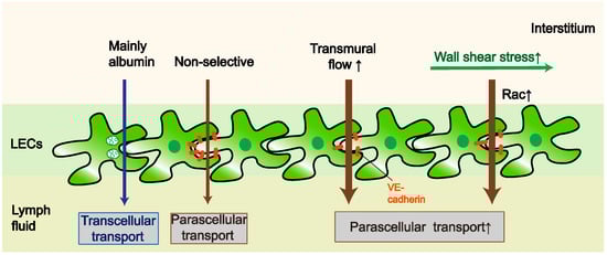 For endothelial cells, cell junction molecules (such as vascular endothelial-Cadherin (VE-Cadherin), which is particularly enriched in button junctions) are responsible for cell–cell interactions, and integrins mediate interaction between endothelial cells and extra cellular matrix []. These two mediators are connected with cytoskeletal machinery and several signaling molecules when facing the mechanical signals such as shear stress (SS) or stretch. Among all mechanical signals, SS is the most studied stimuli. There are two kinds of SS in vessels. Laminar shear stress (LSS) exists in straight long vessels, and oscillatory SS is generated when fluid is disturbed at branch points []. Barrier function of the lymphatic endothelium increases with enhanced laminar flow [,], mechanism of which may be related to the small GTPase Rac1, which directs cytoskeletal reorganization at intercellular junctions []. Collagen fibers of LECs are attached to anchoring filaments, which can be pulled apart by increased interstitial pressure, resulting in opening of the LV lumen and enhancing uptake of lymph components []. After a drop in interstitial fluid pressure, the anchoring wire springs back to close this permeable channel. Most LVs of skin are relatively collapsed in shape under physiological condition [], and they are pulled open by anchoring filaments under pathological condition []. However, overextension of LVs leads to the impairment of barrier and leakage []. This paracellular fluid transportation in lymphatic endothelium generates transmural SS. Decreased expression of tight junction, in the presence of elevated transmural SS, leads to increased permeability of endothelium [,]. Since transmural SS can help recruit CCR7+ immune cells into LVs and lymph nodes via promoting expression of cytokine CCL21 expression in LECs, it has been regarded as an important regulator of LEC function as well as an inflammatory cue at early stage for lymphatics []. Reduced transmural SS caused by lymphatic drainage stagnation in secondary lymphedema or experimental lymphedema mode reduced dendritic cells transmigration into lymph [].