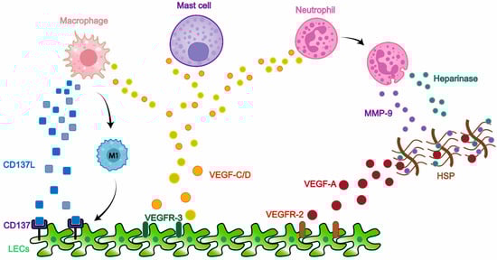 Lymphangiogenesis can also be mediated by the cooperation of immune cells (Figure 2) since many inflammatory diseases are accompanied by enhanced lymphatic growth [].