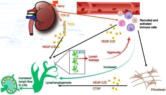 In kidney, tubule cells [] and infiltrating macrophages [] are regarded as two main sources of lymphangiogenic factor VEGF-C. Active lymphangiogenesis at the site of renal interstitial lesions develops in different fibrosis models [,] and CKD patients with multiple pathologies []. To date, although the pathophysiological relevance of this strong association remains controversial, dual effects of lymphangiogenesis on renal fibrosis development are widely accepted. The beneficial influence is that proliferated LVs assist removal of inflammatory cytokines from injured tissues, moderating tubular epithelial damage and fibrosis progression [,]. LVs proliferation, which was promoted by recombinant human VEGF-C, attenuated renal fibrosis with reduced infiltrating macrophages and level of transforming growth factor β1 (TGFβ1) in UUO mice []. However, other research supports a detrimental role for LVs formation in the setting of chronic kidney injury. Like pre-existing LVs, newly generated LVs also express CCL21, which enhances the recruitment of CCR7+ immune cells into renal draining lymph nodes and spleen, thereby aggravating systemic inflammation and renal fibrosis []. Inhibition of either lymphangiogenesis or CCR7+ dendritic cells recruiting into lymph nodes could prevent renal disease progression []. Severe proteinuria can stimulate TECs to synthesize mediators that recruit inflammatory chemokines, triggering lymphangiogenesis before renal fibrosis []. Interestingly, new injury-induced LVs were found near glomeruli with tuft adhesions [], which might fit with the theory that urine filtrates incorrectly into interstitium in these areas []. In diabetic models, sustained inflammation and upregulation of VEGF-C cause dysregulated proliferation of disorganized LVs, accelerating kidney damage []. Indeed, SAR131675, a selective VEGFR-3 inhibitor, is reported as a promising therapy since it ameliorates renal fibrosis through inhibiting lipotoxicity-related LVs formation []. Notably, renal fibrosis may in turn act on the formation of LVs. Following UUO-induced injury, the powerful fibrogenic cytokines TGFβ1 and connective tissue growth factor (CTGF) have been proved to be participants in lymphangiogenesis by activating VEGF-C [,]. TGFβ1 is the central player of fibrosis and has been found to improve VEGF-C expression in tubule cells as well as macrophages []. Additionally, elevated CTGF expression was detected around new-brown LVs in patients with obstructive nephropathy and diabetic nephropathy, suggesting a possible involvement of CTGF in lymphangiogenesis []. Development of fibrosis in several models can be attenuated by reduction of CTGF [,,] (Figure 3).