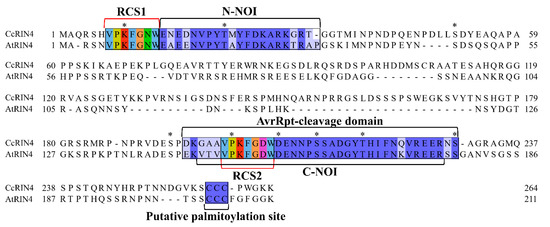Sequence comparison analysis result of Arabidopsis and Citrus clementina RIN4 proteins. RCS 1 and 2: RIN4 cleavage site 1 and 2; the AvrRpt-cleavage domain was predicted by using CDD; *: represents the conserved amino acid residue that might play roles in the posttranscriptional modifications of RIN4. N-NOI and C-NOI represents the N-terminal nitrate induced domain and C-terminal nitrate induced domain, respectively.