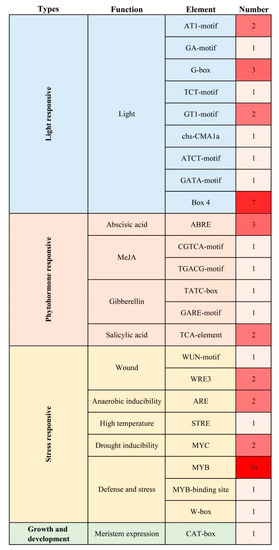 Cis-acting elements identified in the Citrus clementina RIN4 promoter. According to the annotated functions of the identified elements, cis-elements were mainly divided into four types, including light responsive, phytohormone responsive, stress responsive and growth and development related. The numbers represent the abundances of identified cis-elements in the RIN4 promoter, and the redder the color, the higher the abundance.