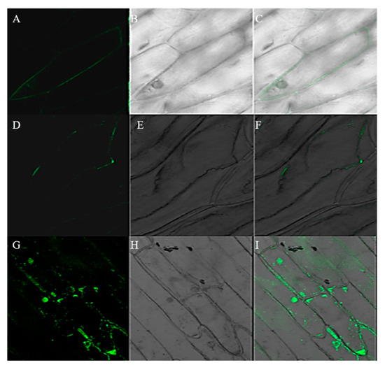 Subcellular localization of the RIN4-GFP protein in onion epidermal cells. (A–C): before plasmolysis; (D–F): post plasmolysis; (G–I): pBEGFP control vector; (A,D,G): fluorescent field; B, (E,H): bright field; (C,F,I): merged field.
