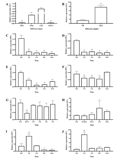 Expression levels of RIN4 in different organs (A), in leaves of HLB infected citrus (B) and in leaves under different treatments (C–J). FC: fold change; (A): Different organs; (B): RIN4 expression in leaves of healthy and HLB infected citrus; (C): GA treatment; (D): IAA treatment; (E): JA treatment; (F): SA treatment; (G): PEG treatment; (H): Wound treatment; (I): Salt treatment; (J): ABA treatment; The results were shown as mean ± standard deviation (SD); *: significant difference identified at p-value < 0.05 compared with the control; **: very significant difference identified at p-value < 0.01 compared with the control.