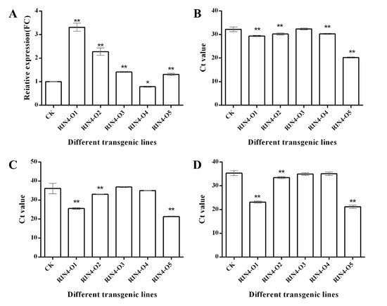Total RNA of five RIN4-overexpression transgenic and five non-transgenic control ‘Shatianyou’ pomelo leaves were extracted. The expression levels of RIN4 were analyzed by qRT-PCR. Except overexpression line (O) RIN4-O4, the expression levels of RIN4 in the other four RIN4-overexpression transgenic lines were all very significantly greater than that in the control. The greatest expression, approximately 3.5 times greater than that of the control was found in RIN4-O1 (Figure 5A).