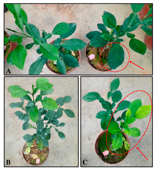 After three months, grafted transgenic and control pomelo plants that were ~20 cm tall were subjected to HLB inoculation by grafting two CLas-infected red tangerine buds onto the rootstocks [38]. The phenotypes of the CLas-inoculated plants were observed.