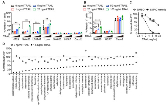 Screening a chemical library to identify agents to sensitize cells to tumor necrosis factor-related apoptosis-inducing ligand (TRAIL)-induced cell death. (A,B) Various colon cancer cells were treated with TRAIL at the indicated concentration for 16 h. The percentage of annexin V+ cells was determined via flow cytometry. (C) HT29 cells were pretreated with 0.5 µM second mitochondria-derived activator of caspase (SMAC) mimetic (birinapant) for 30 min and then treated with TRAIL at the indicated concentration for 24 h. The intracellular ATP level was determined via CellTiter-Glo luminescent cell viability assay. (D) HT29 cells were treated with either chemical compounds alone (white circle) or the compounds, birinapant, and TRAIL (black circle) as described in Materials and Methods. The intracellular ATP level was determined as in (C). Results are represented as the mean ± standard deviation (SD) of triplicate samples (A–C). ns, not significant. ** p < 0.01; *** p < 0.001, **** p < 0.0001 (unpaired t-test with Welch’s correction in (A) and one-way analysis of variance (ANOVA) in (B)).