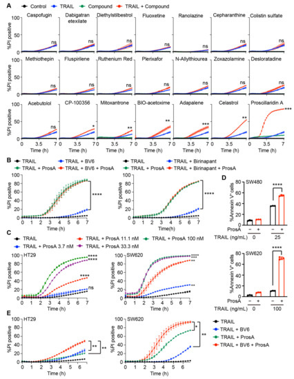Proscillaridin A enhances TRAIL-induced cell death. (A) HT29 cells were pretreated with 1 µM of various compounds for 24 h and then treated with 5 ng/mL TRAIL. Statistical analysis was performed by using two-way ANOVA (TRAIL alone vs. TRAIL + Compound). (B) HT29 cells were pretreated with 1 µM proscillaridin A (ProsA) for 24 h. Subsequently, the cells were treated with 0.5 µM SMAC mimetic (BV6 or birinapant) for 1 h and further treated with 5 ng/mL TRAIL for the indicated time. Statistical analysis was performed by using two-way ANOVA (TRAIL + SMAC mimetic vs. TRAIL + SMAC mimetic + ProsA). (C) HT29 and SW620 cells were pretreated with the indicated concentration of proscillaridin A for 24 h and then treated with TRAIL at 10 and 33 ng/mL for HT29 and SW620 cells, respectively. Statistical analysis was performed by using two-way ANOVA (vs. TRAIL alone shown in black). (D) SW480 and SW620 cells were pretreated with 11.1 nM proscillaridin A for 24 h and then treated with TRAIL for 16 h. The percentage of annexin V+ cells was determined via flow cytometry. Statistical analysis was performed via an unpaired t-test with Welch’s correction. (E) HT29 and SW620 cells were pretreated with 11.1 nM proscillaridin A for 24 h and then 0.5 µM BV6 for 1 h. After pretreatment, the cells were treated with TRAIL at 1 and 11 ng/mL for HT29 and SW620 cells, respectively. Statistical analysis was performed by using two-way ANOVA (TRAIL + BV6 or ProsA vs. TRAIL + BV6 + ProsA). The percentage of PI+ cells was determined by using Operetta CLS (A–C,E). Results are represented as the mean ± SD of triplicate (right panel in (B), (D), HT29 in (C)) or duplicate ((A), left panel in (B), SW620 in (C), (E)) samples. Results are representatives of two independent experiments (A–E). ns: not significant. * p < 0.05; ** p < 0.01; *** p < 0.001; **** p < 0.0001.