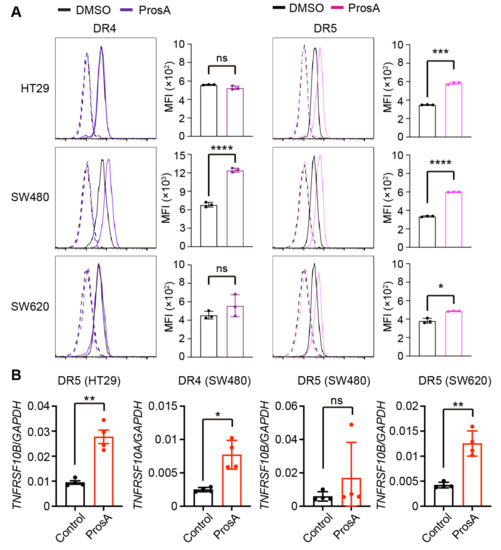 Proscillaridin A upregulates the expression of TRAIL receptors in a cell type-specific manner. (A) HT29, SW480, and SW620 cells were treated with 11.1 nM proscillaridin A (ProsA) for 24 h. Cell surface expression levels of DR4 and DR5 were determined via flow cytometry. Dotted lines indicate the cells stained without primary antibodies. Representative histograms from three independent experiments are shown. Bar-dot graphs indicate the mean fluorescence intensity (MFI). Results are represented as the mean ± SD of triplicate. (B) Relative gene expression levels of TNF receptor superfamily member 10a (TNFRSF10A; DR4) and TNFRSF10B (DR5) was determined via quantitative reverse transcription-polymerase chain reaction (qRT-PCR). The expression levels of the target gene were normalized to that of glyceraldehyde-3-phosphate dehydrogenase (GAPDH). Results pooled from two independent experiments are shown (n = 4). Results are represented as the mean ± SD. * p < 0.05; ** p < 0.01, *** p < 0.001; **** p < 0.0001 (unpaired t-test with Welch’s correction). ns, not significant.