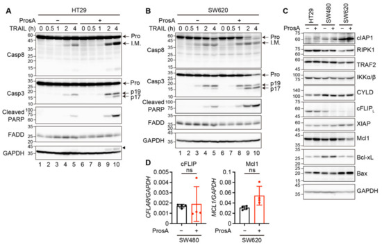 Proscillaridin A enhances TRAIL-induced caspase activation. (A,B) HT29 and SW620 cells were pretreated with 11.1 nM proscillaridin A (ProsA) for 24 h and then treated with TRAIL at 5 and 100 ng/mL for HT29 and SW620 cells, respectively. An arrowhead indicates the residual signal from the previous blot (Casp8). (C) The cells were treated with 11.1 nM ProsA for 24 h. Whole cell extracts were subjected to Western blotting. Pro, proform; I.M., intermediate form. Blots are representatives of two independent experiments (A–C). (D) Relative gene expression levels of cellular FADD-like IL-1β converting enzyme-like inhibitor protein (CFLAR/cFLIP) and MCL1 were determined via qRT-PCR. The expression levels of target genes were normalized by that of GAPDH. Results pooled from two independent experiments are shown (n = 4). Results are represented as the mean ± SD. ns, not significant.