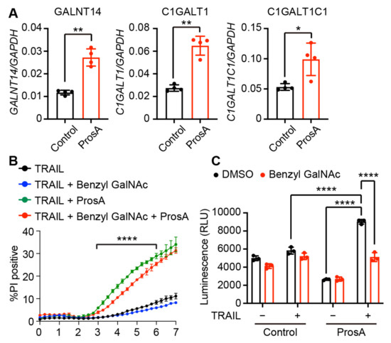 The expression of GALNT14 or C1GALT1C1, which are involved in the generation of O-glycans, promotes TRAIL-induced caspase 8 activation and cell death [13,14,15]. We found that proscillaridin A significantly enhanced the expression levels of these genes and C1GALT1, which is critical for the synthesis of type 1 and 2 O-glycans, in HT29 cells (Figure 5A). To examine whether the upregulation of these enzymes contributes to the TRAIL-sensitizing effect of proscillaridin A, we treated HT29 cells with benzyl-α-GalNAc, which inhibits O-glycan elongation at the initial GalNAc residue [23,24]. Treatment with benzyl-α-GalNAc slightly but significantly suppressed proscillaridin A and TRAIL-induced cell death at the early and middle time points (3–6 h after TRAIL stimulation), but not at the late time points (6–7 h after TRAIL stimulation) (Figure 5B; Figure S5A). In addition, proscillaridin A-mediated increase in TRAIL-induced caspase activation was significantly suppressed by benzyl-α-GalNAc treatment (Figure 5C). These results suggest that proscillaridin A sensitizes HT29 cells to TRAIL-induced cell death partly via O-glycosylation.