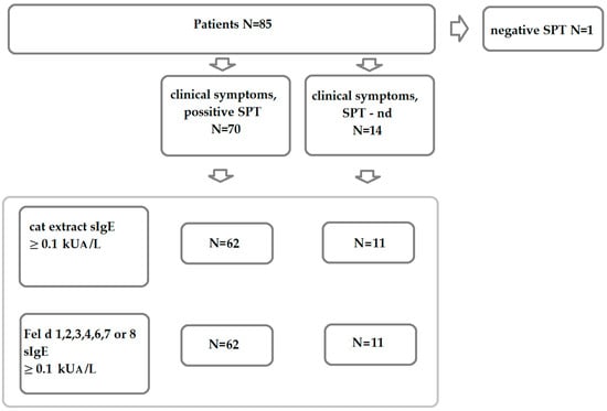 As a first step, all patients completed the standardized ISAAC questionnaire for obtaining first-line evidence for or against an allergic phenotype []. Subjects who were positive according to the ISAAC questionnaire were further investigated for the presence of allergic sensitization using standard diagnostic methods for allergy including anamnesis, skin prick test [], and total and specific IgE determination according to a traditional diagnostic pathway []. At the time of testing, patients had not received any therapy. Skin prick tests for verification of sensitization to cat could be performed in 66 of the patients who reported allergic symptoms upon cat exposure using cat allergen extracts from Microgen (Moscow, Russia) or Stallergenes (Antony, France). Allergic symptoms upon cat exposure were classified regarding asthma according to the ATS/ERS criteria from 2014 [], and they were classified regarding rhinitis according to GINA guidelines [,] and European guidelines for the classification of rhinitis [,]. Furthermore, guidelines for the assessment of conjunctivitis [] and skin manifestations were recorded as recommended []. Particular attention was paid to the discrimination of atopic dermatitis and urticaria. Only patients with atopic dermatitis were included under the term “dermatitis”. The study was approved by the ethics committees of the institutional review boards of Sechenov University and Moscow-based institutions and by the Ural State Medical University; the study was conducted according to the Declaration of Helsinki. Each patient signed an informed consent form.