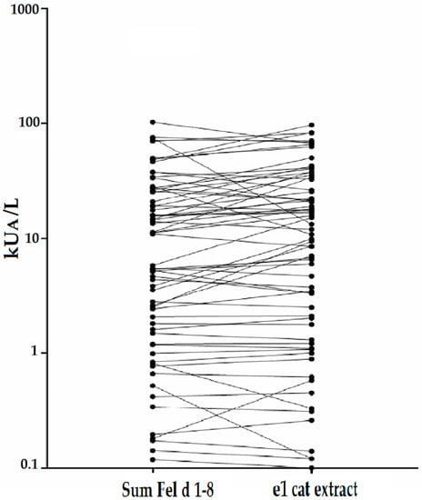 Cumulative allergen-specific IgE levels (i.e., the sum of IgE levels specific to the seven tested allergen molecules) were significantly correlated with IgE levels specific to cat allergen extract, indicating that the seven allergen molecules can be used to replace the cat allergen extract for measuring allergen-specific IgE levels (Figure 2). Specific IgE levels were comparable for the cat allergen extract and the sum of allergen molecules for most patients; however, certain patients showed higher IgE levels specific to cat allergen extract than to the cat allergen molecules or vice versa (Figure 2). Interestingly, when considering cumulative IgE levels greater than or equal to 0.1 kUA/L for the sum of allergen molecules, cat allergen-specific IgE reactivity was detected in 75 out of 84 patients with cat-related allergic symptoms. Thus, two more patients were detected with allergen molecules than with the cat allergen extract (Table S1). However, no cat allergen-specific IgE was detected in 9 out of 84 patients with cat-related allergic symptoms (Table S1). In five of the nine patients, a skin prick test with the cat allergen extract was performed, yielding positive results. In four patients, no skin testing was performed, but allergic symptoms related to cat exposure were recorded (Table S1).