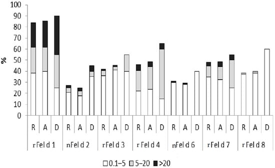Prevalence and magnitude (y-axis: percentage of sensitized patients, measured in kUA/L, as indicated at the bottom) of IgE sensitization to cat allergen molecules in cat allergic patients (n = 73) with different symptoms (R: rhinitis; A: asthma; D: dermatitis).