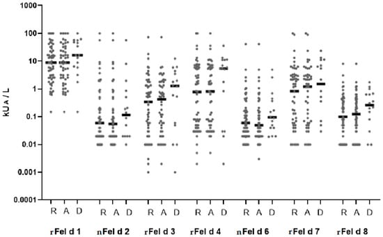 IgE levels (y-axis: sensitization, measured in kUA/L; median IgE levels are indicated by horizontal bars) specific to cat allergen molecules (Fel d 1–Fel d 8) in patients with different symptoms of cat allergy (R: rhinitis; A: asthma; D: dermatitis).
